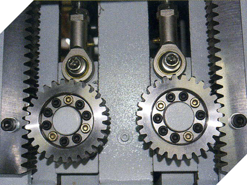 - Double pressure beams transmitted with rack and pinion combined with air cylinders equality press between cutting line